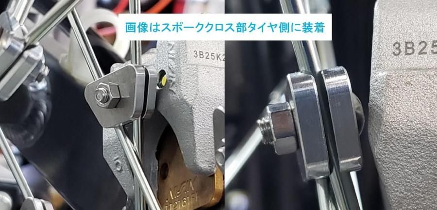注意:キャリパー側のスポーククロス部タイヤ側にスポークブースターを取り付ける場合、キャリパー裏側とのクリアランスが狭い為、スポーククロス部ハブ側に取付するか、又はキャリパーの裏側を若干削るなどの加工が必要な場合があります。