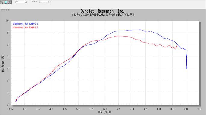 レッド:フルノーマル(ノーマルマフラー) ブルー:OUTEXレーシングエアファンネル(ノーマルマフラー) (グロム2013年モデル、ノーマルエアフィルターで計測しました)