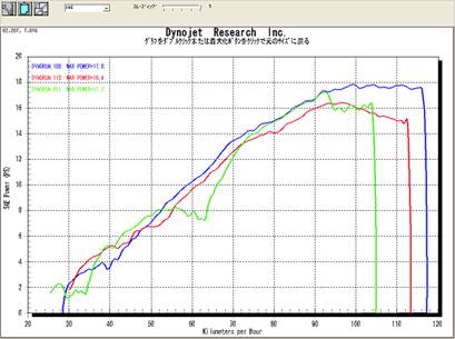 エイプ50 STD車両での比較 赤 STDマフラー 青 OUTEXマフラー |
