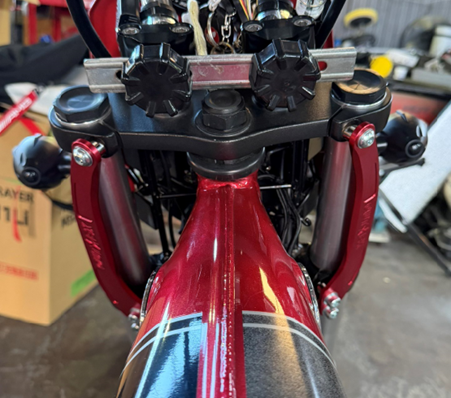 Nさん グロム 品番SS16-Red @取り付け作業 必要なパーツが全て揃っており、説明書にも説明に加えて画像も添付されているのですぐに分かりました。取り付け時の注意点なども書かれているので、素人の自分でも安心して取り付けできました。時間としては15分もあれば取り付けできます。 A走行の感想 フロントの剛性が上がったのが体感で実感できます。今までフロントフォークが沈めば沈むほど、ハンドル周りも荷重に比例してしなっている感じがあったのですが、明らかにブレーキングやコーナリングがガッチリしたのが分かりました。 B購入した理由 見た目と性能の両面で魅力的だったので購入させていただきました。 C5段階評価★★★★★ デザインは申し分ないです。かっこいい。個人的には価格がネックだったので、★4つかなと考えていました。しかし、実際に走行してみるとこんなにも変わるのかと体感できたので、とても良かったと思います。★5つです。 D質問、ご要望 ハンドルストッパーはテープで貼り付けるだけだったのですが、テープの耐久性はどうなのでしょうか。念入りに脱脂を行なってから貼り付けはしましたが、少し気になりました。 回答:使用されているテープは屋外耐候性に優れていますので脱脂をしっかり行っていれば剥がれることはありません。転倒などの衝撃があった場合は確認してください。