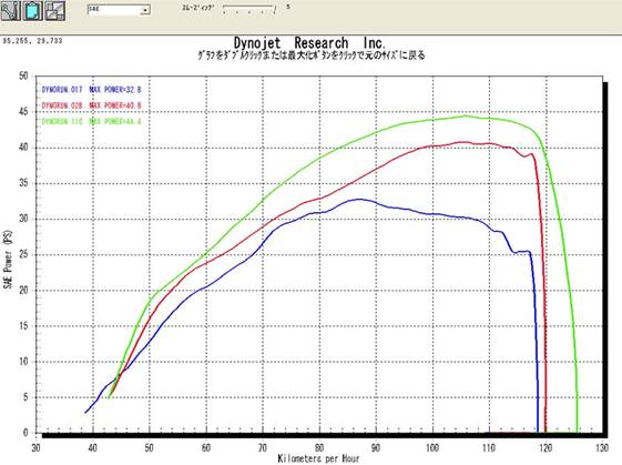 テスト車両:ノーマルエンジン+FCR39 ノーマルマフラー OUTEXマフラー OUTEXマフラー+エアークリーナーボックス穴加工 |