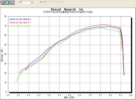 (マップ書き換え済み KTMディーラーで対応) グリーンSTDマフラー ブルーOUTEXマフラー (計測時の仕様:フロントパイプΦ48.6、センターパイプ1Φ48.6、センターパイプ2Φ54+Φ60.5、TUP有り、バッフル有り) レッドOUTEXレース仕様 (計測時の仕様:フロントパイプΦ48.6、センターパイプ1Φ54、センターパイプ2Φ54+Φ60.5、TUP無し、バッフル無し) |