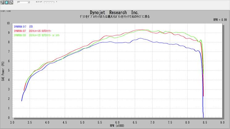 2021モンキー125 パワーグラフ ブルーSTDマフラー レッドOUTEXマフラー グリーンOUTEXマフラー(トルクアップパンチングパイプ無し) |