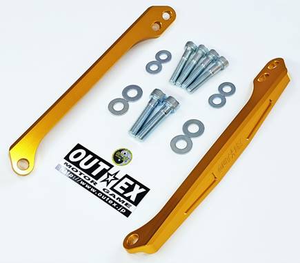 アッパーとアンダーを連結している為、特に捩れ剛性が上がります。 主な効果 @クイックなハンドリング/旋回性向上 Aコーナーリングスピードアップ/安定性 Bチャタリング減少 C直進安定性 Dブレーキング時の安定感 Eインナーチューブのスムーズなストローク Fストッピーも距離が伸びました(中しゃち談) |