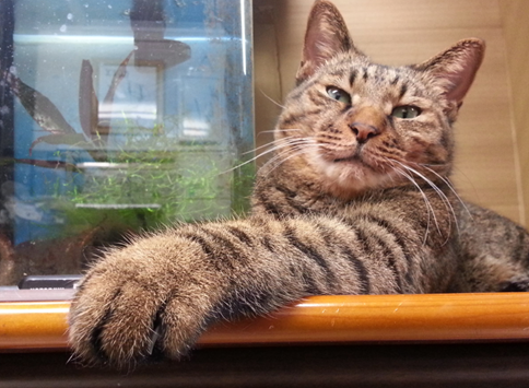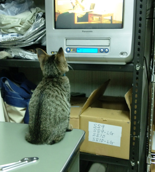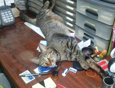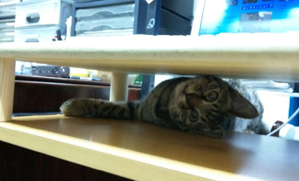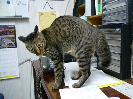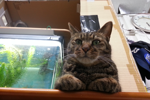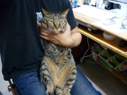 お母ちゃん猫は突然失踪したのです・・・といいますか、猫の習性でお母ちゃん猫は子離れ(親離れ?)をしただけですが。 トラくんは2日間ずっと鳴いて泣いていました。 僕には「お母ちゃんどこ行ったー」と言っているように聞こえて切なかったことを覚えています。 3日目にはお母ちゃんのこと諦めたのか鳴くことを止めました。 そして僕はスタッフ達と相談してトラくんを会社で飼うことにして、この日からプレハブ事務所がトラくんの家になりました。 |