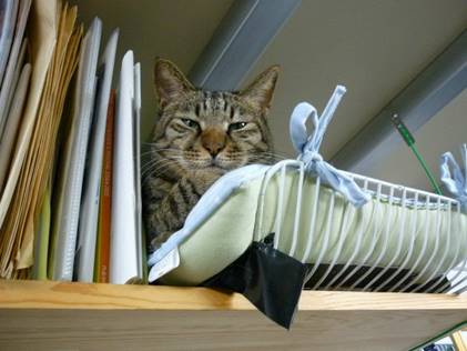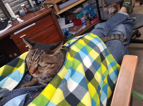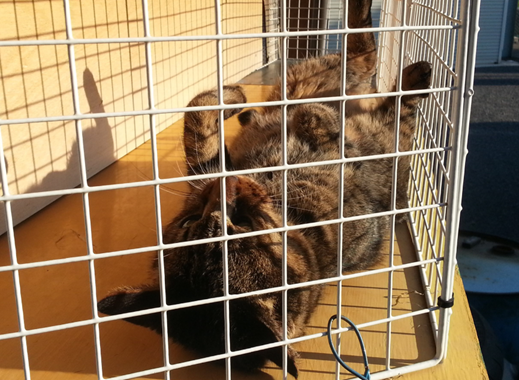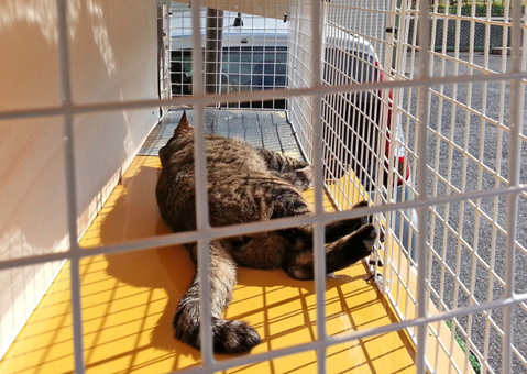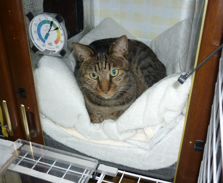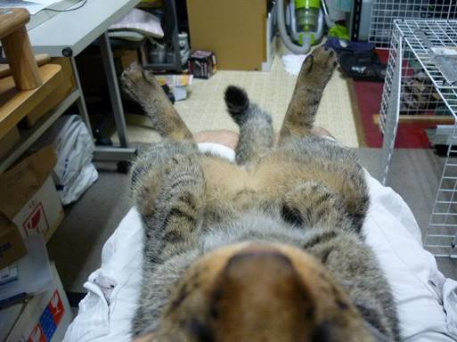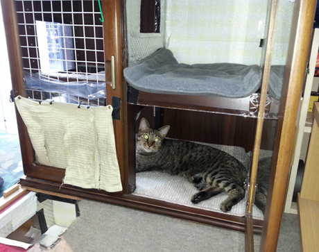 11.7 プレハブ事務所の中でトラ君の2個目のベッドで寝落ちするトラくん。 床に穴を開けてトンネルをくぐると外のケージに出られるようにしました。 |